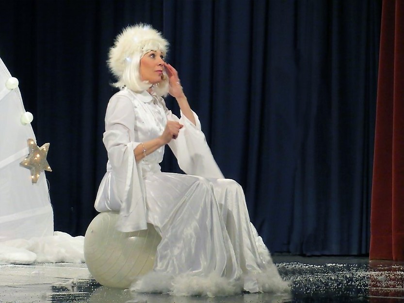 Glasbeno-animacijska predstava z Damjano Golavšek, ki pripoveduje o času, ki prihaja - o zimi. Ta je včasih muhasta. Ravno tedaj, ko vsi, še posebej otroci, pričakujejo sneg, ga noče in noče natrositi. Še dobro, da obstajajo pravljična bitja, ki znajo delati čudeže. Tudi naša Snežna vila je med njimi. Na puhastem oblaku je pravkar pripotovala s severnega tečaja. Pot jo je močno utrudila, zato bo najprej malo zadremala ... Iz sladkega spanja jo zbudi palček. Oder pač ni prostor za spanje, sploh pa na pesmice in sneg čaka veliko otrok. "Otroci zbudimo snežno vilo, pokličimo jo! Snežna viiilaaa!" Zaspanka se prebudi in na preprogi želja s pesmico pričara sneg. Z mladimi gledalci se odpelje v snežno deželo, kjer skupaj zaplešejo snežni ples …